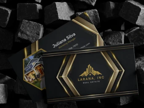 Луксозен дизайн за компания за недвижими имоти. Златен и черен дизайн с геометрични линии и изискано лого, символизиращи престиж и висок клас услуги.