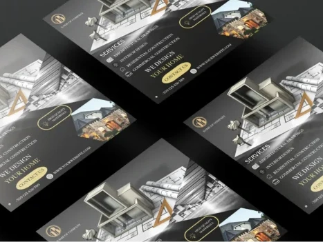 Този дизайн представя елегантен и професионален дизайн за архитектурна или строителна компания. Визуалният фокус е върху 3D модел на модерна сграда, поставен върху чертежи и архитектурни планове, символизирайки внимание към детайла и професионализъм.