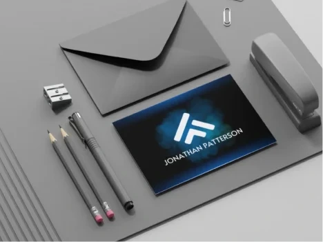 Професионален бизнес дизайн с елегантна сива палитра и сини акценти. Визитната картичка и канцеларските материали създават усещане за корпоративна стабилност и лукс.